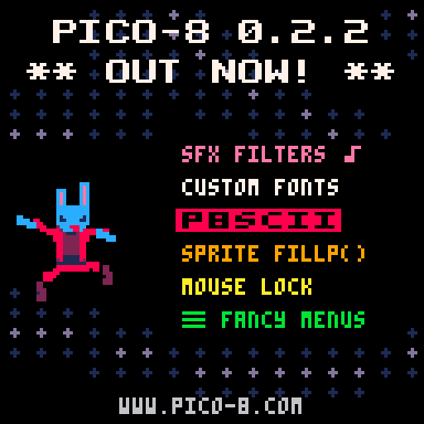 Hey All -- PICO-8 0.2.3 builds are up now. It is mostly bug fixes but has a few new features too. You can read some extra notes in the release post: https://www.lexaloffle.com/bbs/?tid=44512 v0.2.3 Ch...